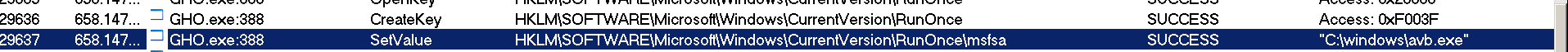 HKEY_LOCAL_MACHINE\SOFTWARE\Microsoft\Windows\CurrentVersion\RunOnce\msfsa 的值可以实现指定exe 文件自启动(=”GHD.EXE”)