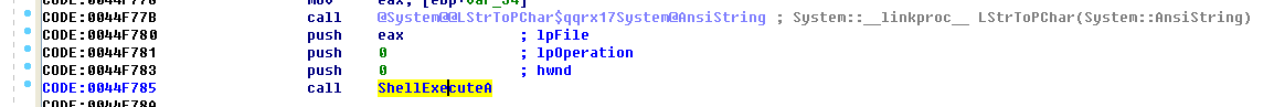 如下图,步骤1中找到内存中exefile文件并free掉,然后通过ShellExecuteA调用 nasm.exe程序。