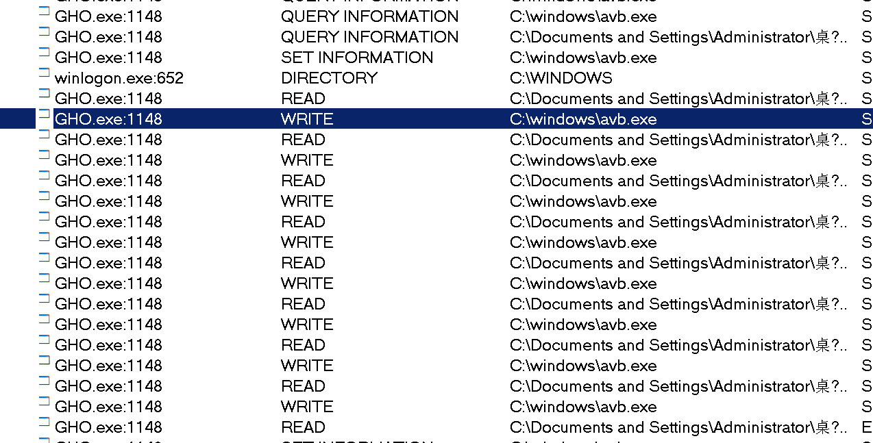 可以观察到系统截获avb.exe,向其写入了数据并修改了数据,自此猜测avb.exe 才是实时感染的程序。